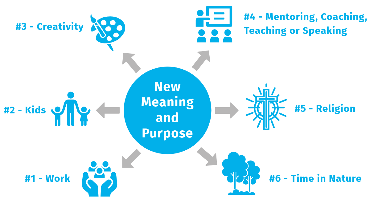 Laying these buildings blocks give them a solid foundation to head off and find a 4) new meaning and purpose in any or a combination of ‘6’ ways: #1 by doing work where they contribute to society, “give back” to their community, fight for a cause they believe in or stand up for something they care about; #2 by leaving a legacy through their kids; #3 through creative pursuits; #4 by “giving back” their expertise through mentoring, coaching, teaching or speaking; #5 via religion; or #6 spending time in nature, travelling and adventure.